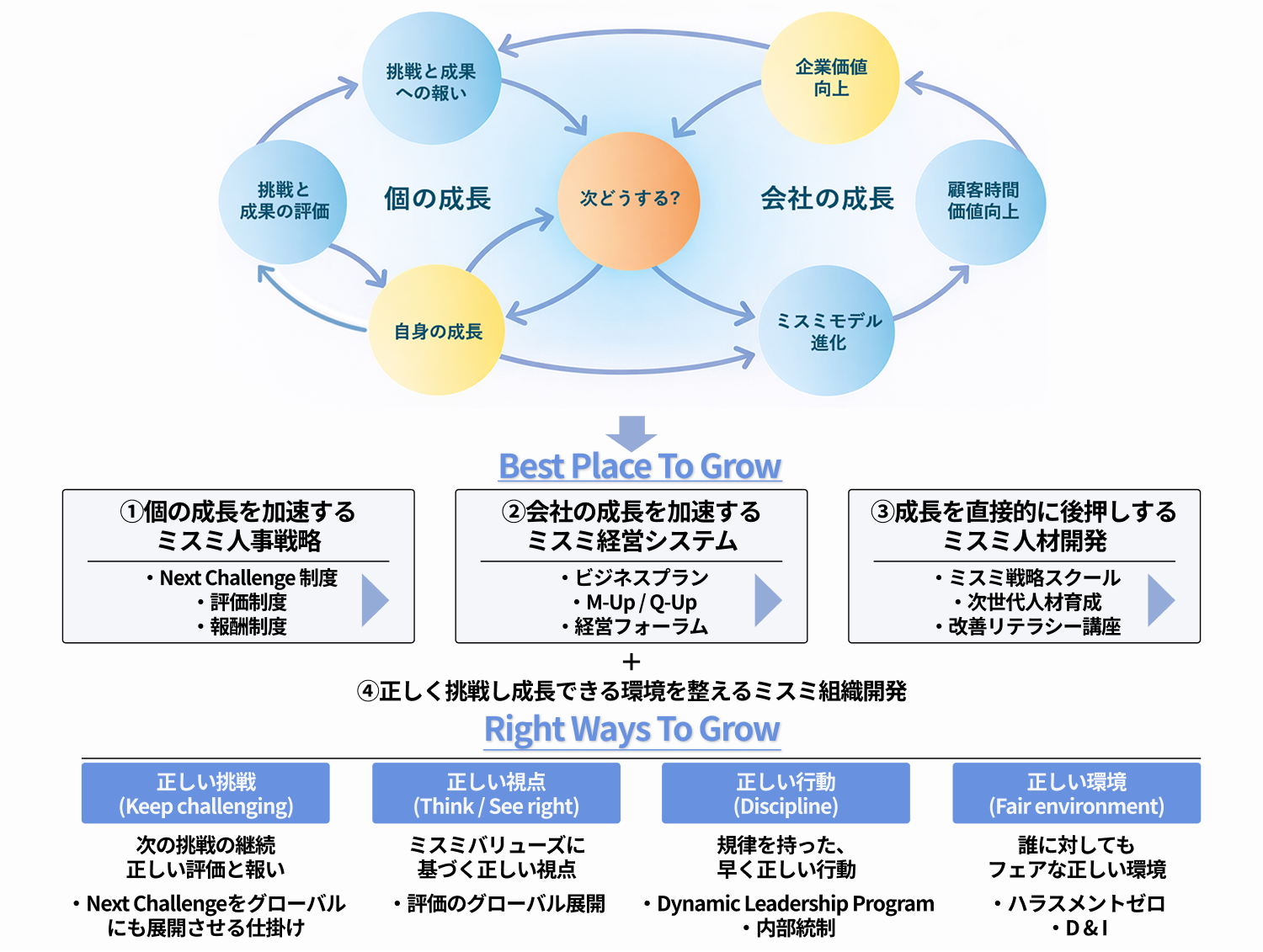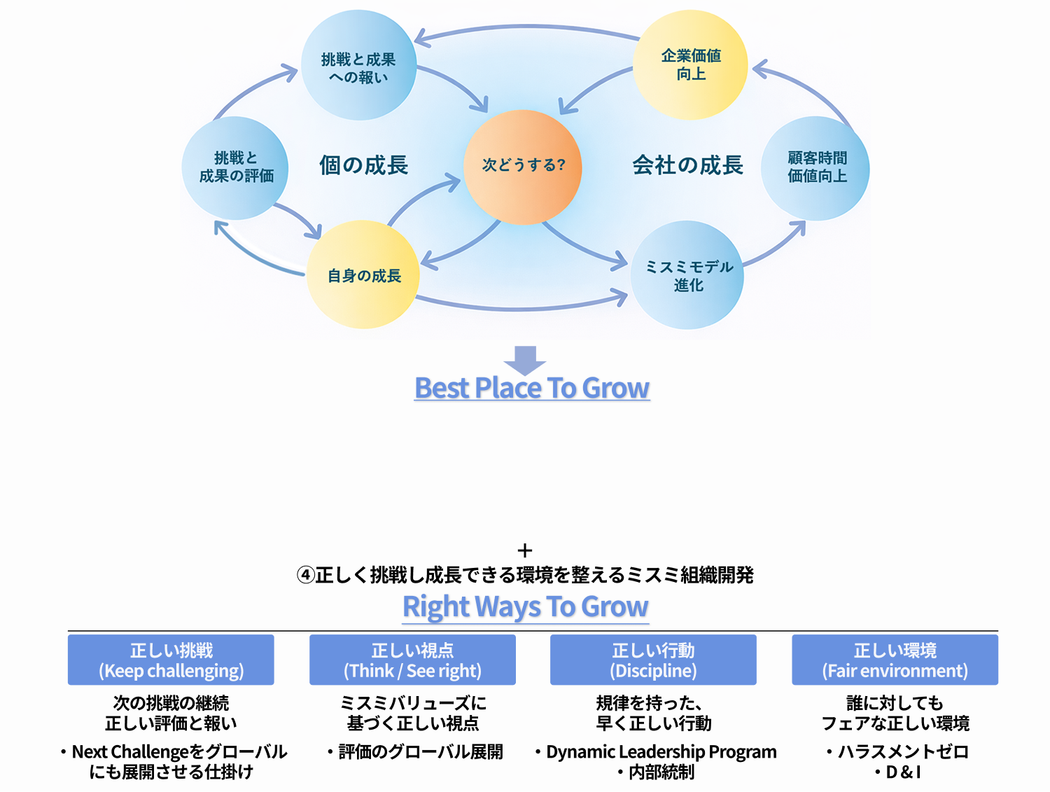 「Best Place To Grow」の実現には、同時に「正しく挑戦し成長する」という志向を伴うことが極めて重要です。正しい挑戦と成長を促す「Right Ways To Grow」の考え方を新たに加え、社員も組織も最も早く、それぞれに最も適した成長を実現する環境を整備します。