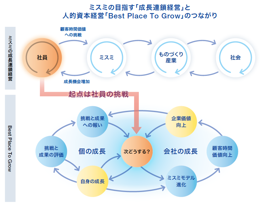 「次どうする?」を常に、社員全員が自分自身に、そして周囲に問いかけ、実際に「次」に挑戦することは、個人の成長につながり、個人の評価(成長実感)を高め、その結果に対する報いとともに、更なる「次の挑戦」に向かう動機付け(成長予感)となる、「個人の元気・付加価値を高める・成長させる(個の成長)」循環を形成します。同時に、個々の「次どうする?」を組織として束ね、ミスミモデルの進化を実現することは、お客様の時間価値向上を実現し、それが企業価値の向上にもつながる「組織の付加価値を高める(会社の成長)」循環につながります。「次どうする?」を起点としたこの2つの循環が常に両輪で回り続けていくことが、当社グループの社員・組織の成長を実現し、成長連鎖経営の礎となります。この構図は当社グループの「人的資本経営」の主軸を表したものであり、当社グループが社員にとって「挑戦に溢れ、世界で最も成長できる会社」であること、すなわち社員にとっての「Best Place To Grow」であることを示しています。