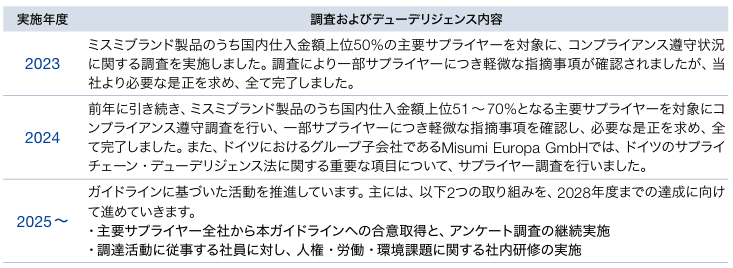 当社グループは「サステナブル調達ガイドライン」を策定し運用することで、サプライチェーン全体における人権尊重、安全衛生の推進、および適切な管理体制の構築を徹底しています。主要なサプライヤーには本ガイドラインへの合意を促すとともに、定期的な実態調査を実施しています。