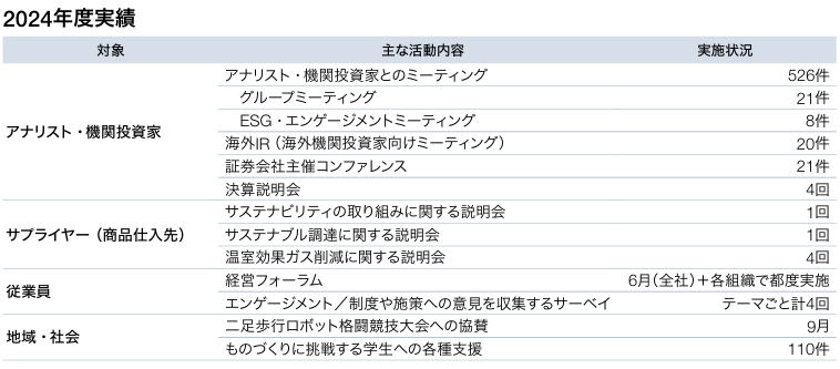 機関投資家との長期的なパートナーシップ構築を目指し、積極的に対話を行っています。経営幹部や担当部門が直接、株主・投資家との意見交換にあたり、2024年度は526件の対話を実施しました。