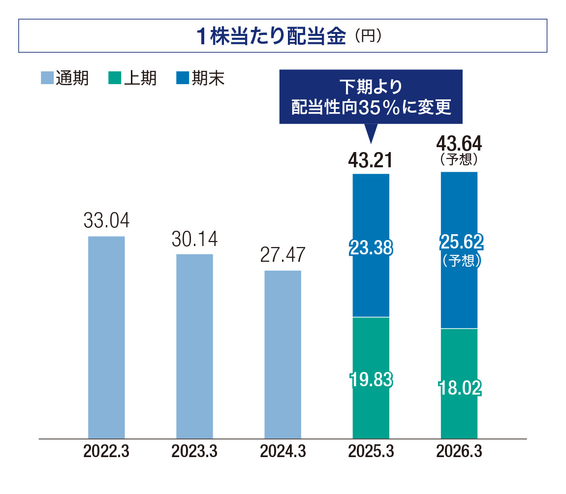 当社は、中長期的な視点での成長投資と株主の皆さまへの還元につきましては、バランスを取りながら実施しており、配当に関しましては、経営基盤拡充、財務体質の強化、資本効率の向上なども勘案し、2025年3月期の期末配当より配当性向35%を基準に決定しております。これにより、1株当たり中間配当金は18円02銭(前年同期比1円81銭減)とさせていただきました。期末配当予想につきましては、2026年3月期連結業績予想の修正により、1株当たり期末配当金を25円62銭(前年同期比2円24銭増)に修正し、年間配当金は1株当たり43円64銭の見込みとなります。
