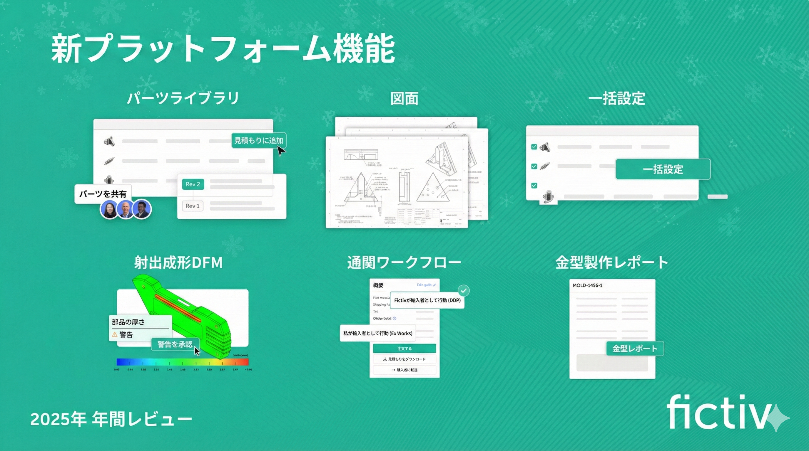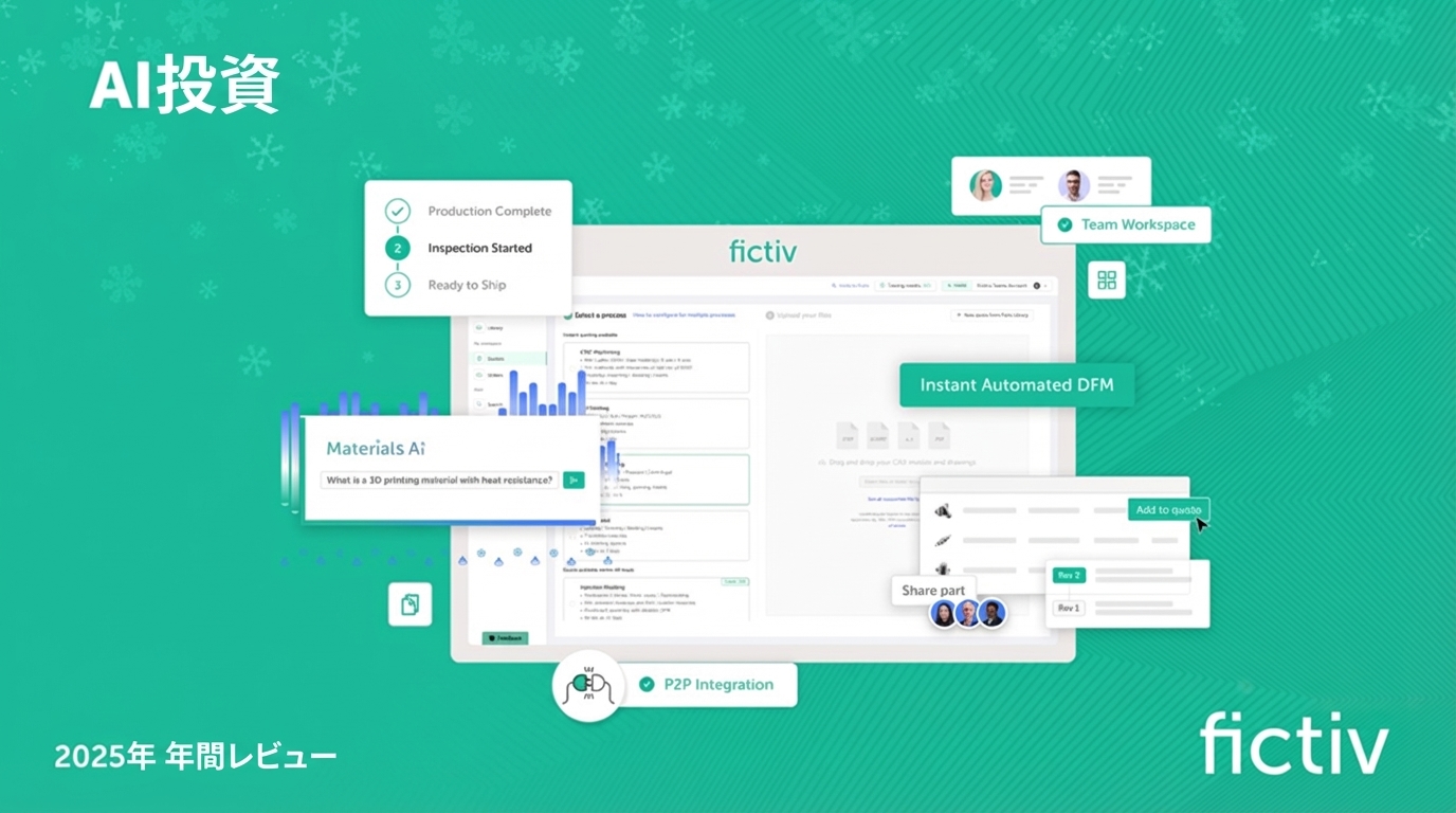 今回追加された新機能は、Fictivが強みとするCNC加工、射出成形、3Dプリント、板金加工、ウレタンキャスティング、ダイキャスティング、コンプレッション成形を基盤とし、より複雑なエンドツーエンドの製造ワークフローに対応する、より統合的でスケーラブルなソリューションを提供します。