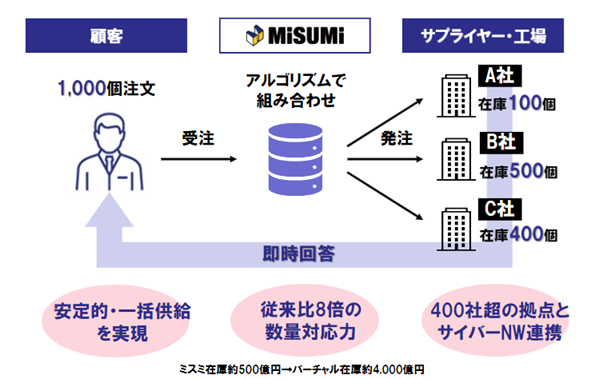 独自開発のシステムにより、国内外400社超のサプライヤー在庫と工場の生産キャパシティをサイバーネットワーク化し一元的に把握することで、提供可能な数量を大幅に拡大しました。また、お客さまの希望数量に対し、その情報を瞬時に組み合わせて価格と納期を自動で表示するアルゴリズムを開発し、大量注文であってもECサイト上で迅速に対応することを可能にしました。