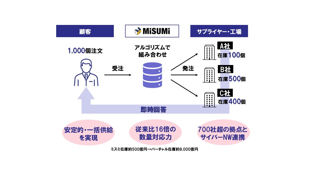 ミスミはこれまで、比較的少量の数量帯の機械部品(標準品)が求められる装置や製造設備向けに強みがあり商品を提供してきましたが、D-JITによって数百、数千単位の中大口の数量帯の提供も可能になります。D-JITは、グローバル700社超のサプライヤーをサイバー連携し、在庫情報を統合・可視化することで、MISUMI ECサイトで提供できる数量を大幅に向上させます。これにより、購買担当者が在庫のあるサプライヤーを探し回る手間や、MISUMI ECサイトで必要数量が揃わない事態が解消されます。