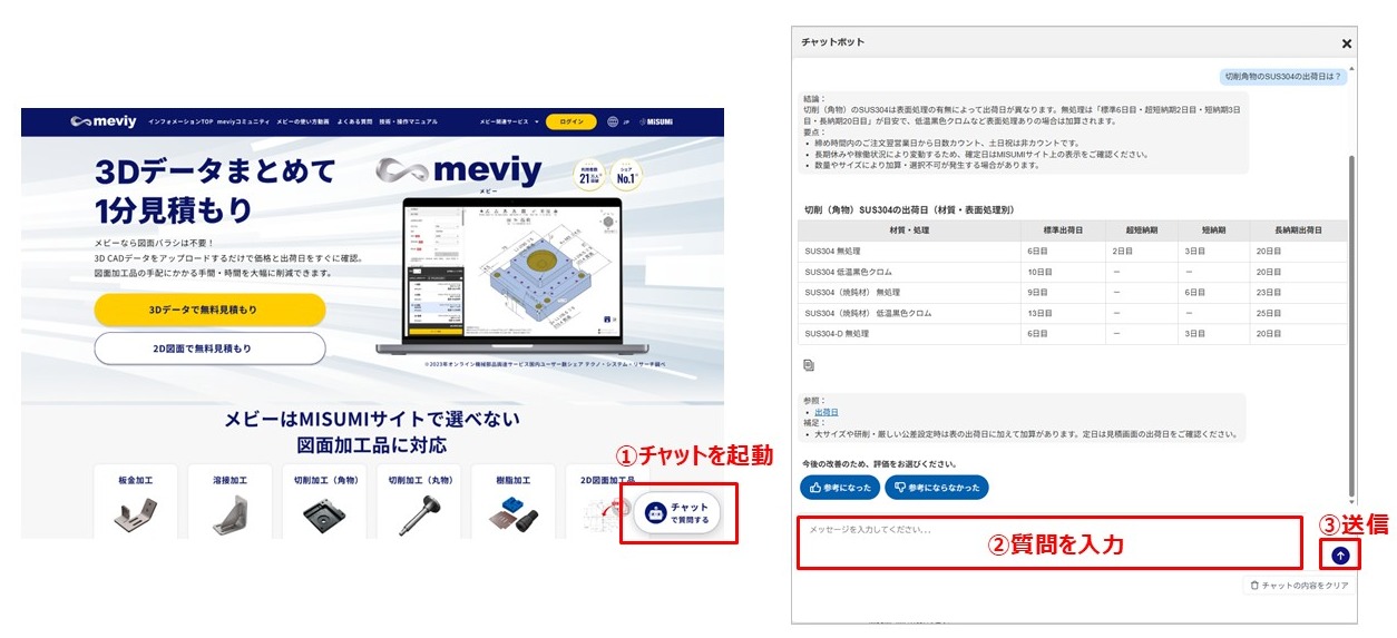 機械部品調達のAIプラットフォーム「meviy(メビー)」(サービス提供元:株式会社ミスミグループ本社)は、2026年2月24日より、AIチャットボットを本格搭載します。本サービスは、LLM(大規模言語モデル)を活用し、300ページを超える膨大な技術・操作マニュアルから、お客さまの質問の意図を汲み取り、最適な回答を瞬時に提示します。