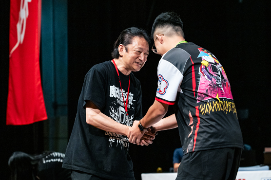 決勝戦の顔合わせは、連覇をかけた『コビス』と、台湾からの出場チームとして初の決勝進出を果たした『JokeMaker』(JRH ROBOTICS)。どちらもロボットとしての性能が高いことはもちろん、その操縦技術で会場を沸かせる熱い戦いを見せて勝ち上がってきた機体です。試合は1分過ぎに『コビス』が奪ったダウンで『JokeMaker』が通信トラブルを起こしてしまい、起き上がりの操作ができないままKO負けとなってしまう、不運な幕切れとなりました。連覇となりましたが、ビスコさんの優勝コメントは「私は多くの負けを経験して、何が足りなかったのか、どうすれば良かったのかを考える機会がありました。今回の優勝はそこでたくさん考えることができたからだと思っています」という謙虚なもの。すでに気持ちは次のROBO-ONEに向かっているようでした。